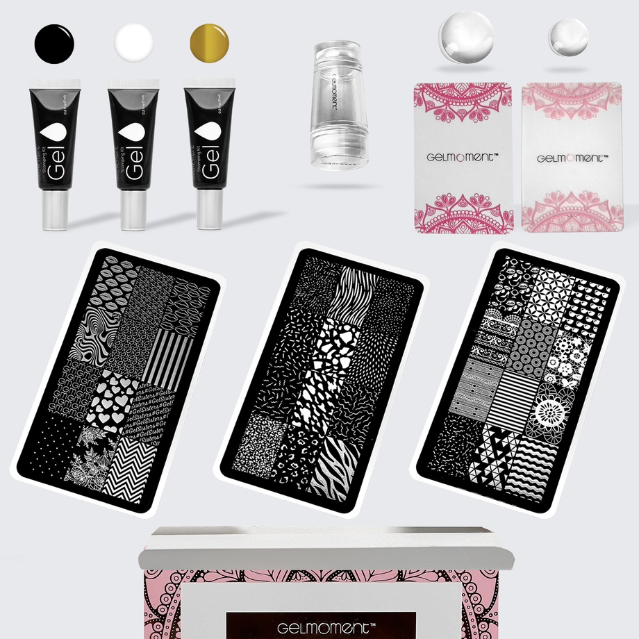 Using our exclusive Stamping Gel in either Gold, Black or White, and included Stamping Plates and accessories, you will be able to easily stamp a variety of designs onto any GelMoment manicure. It's so easy to do, everyone can use it!